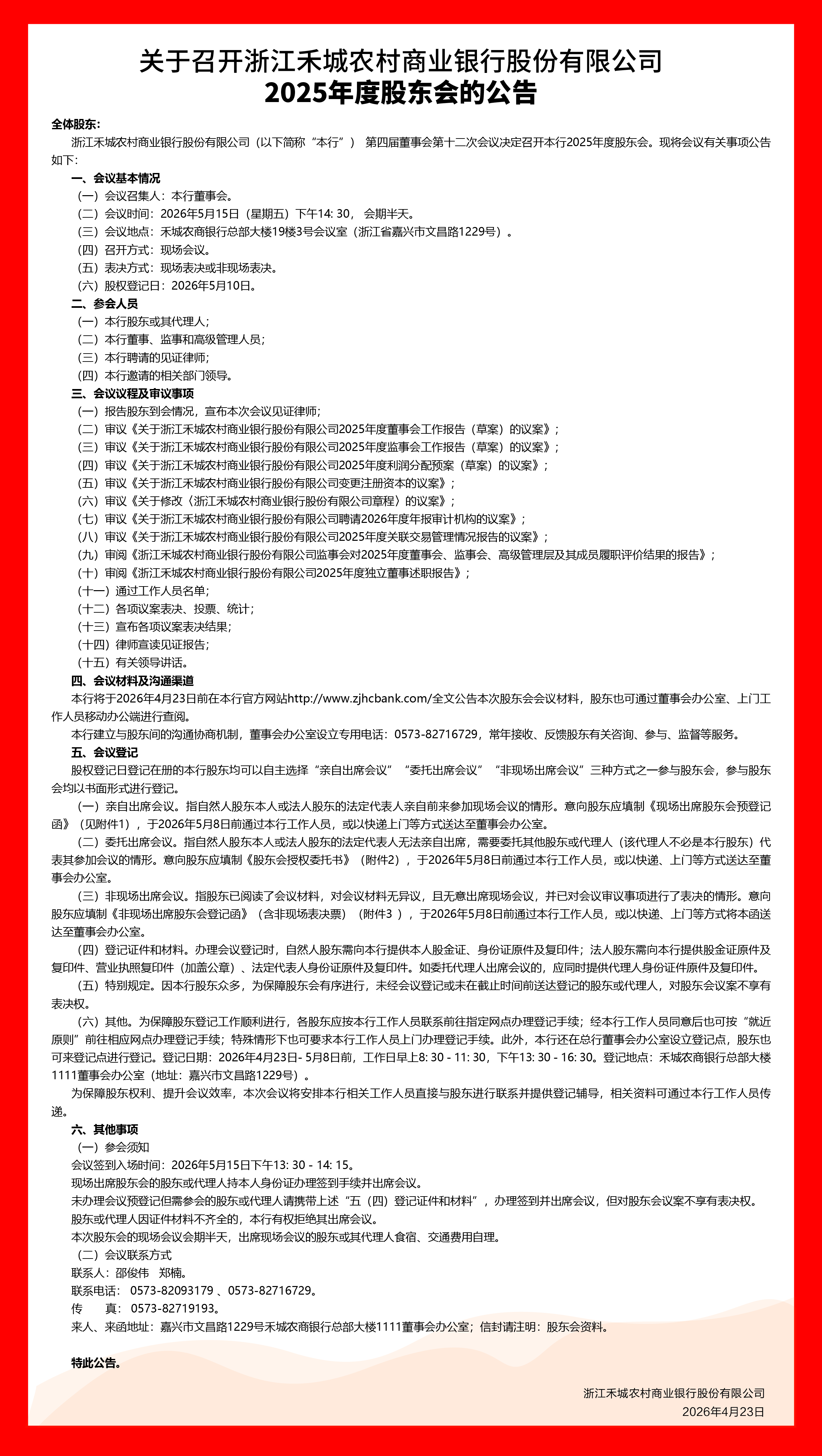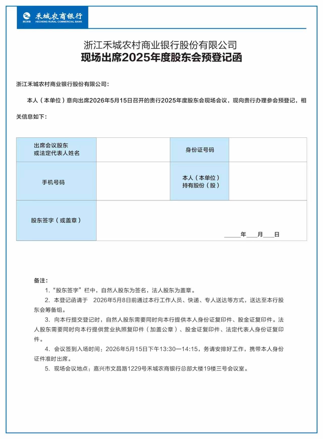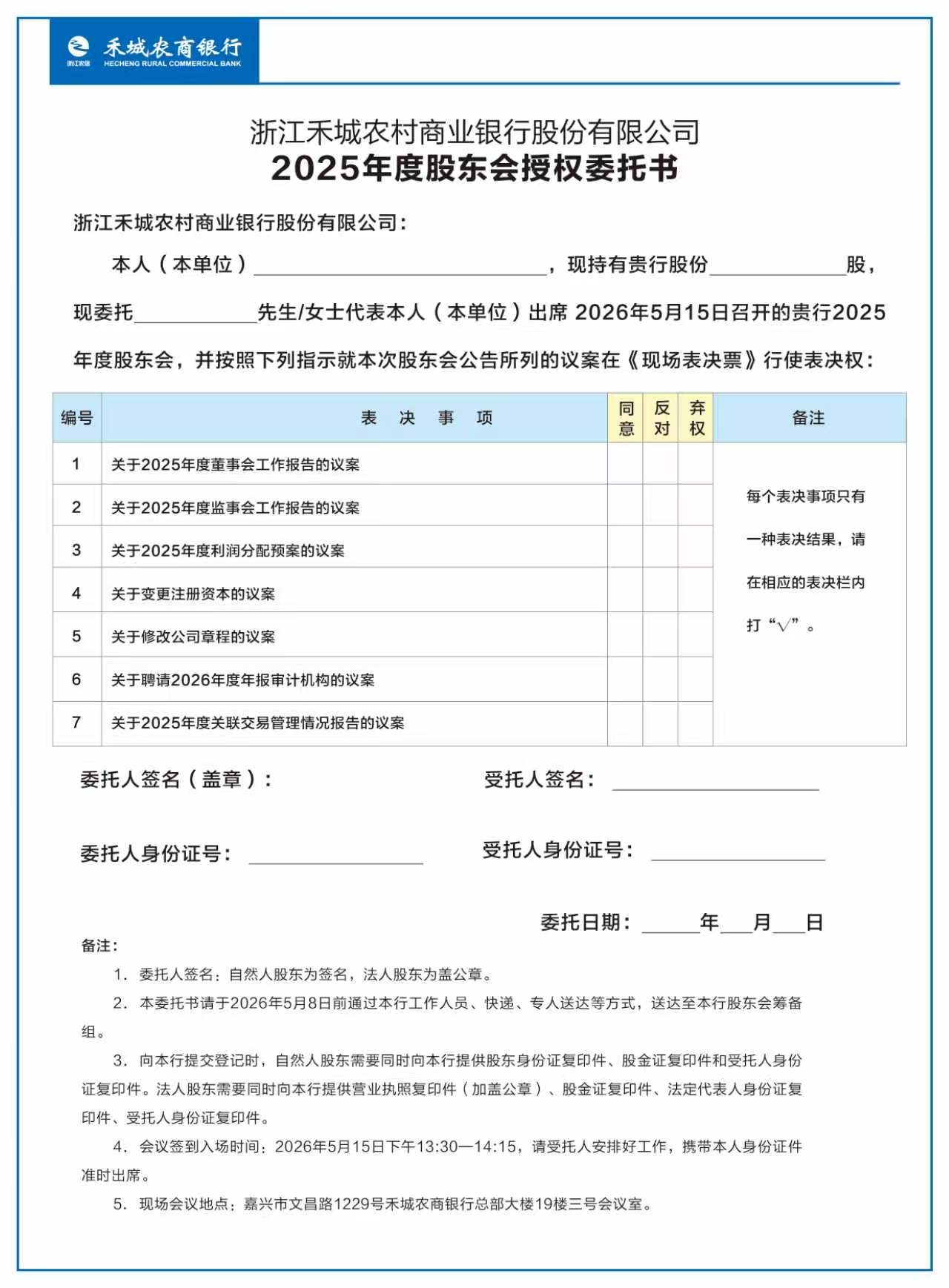 关于召开浙江禾城农村商业银行股份有限公司2025年度股东会的公告